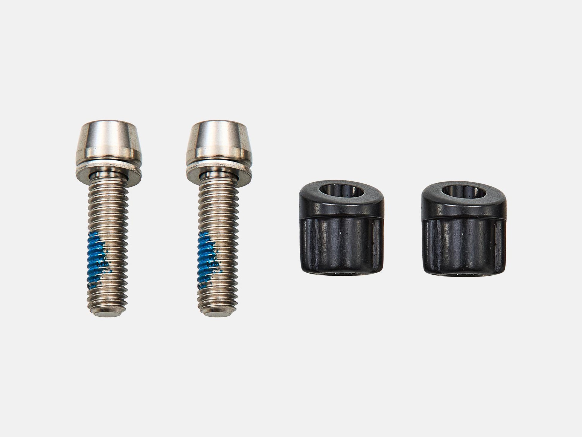 Titanium stuurpenbouten met custom moeren voor het vastzetten van het stuurpengedeelte van een Roval Alpinist II Cockpit waar deze aan de vorkbuis wordt bevestigd.