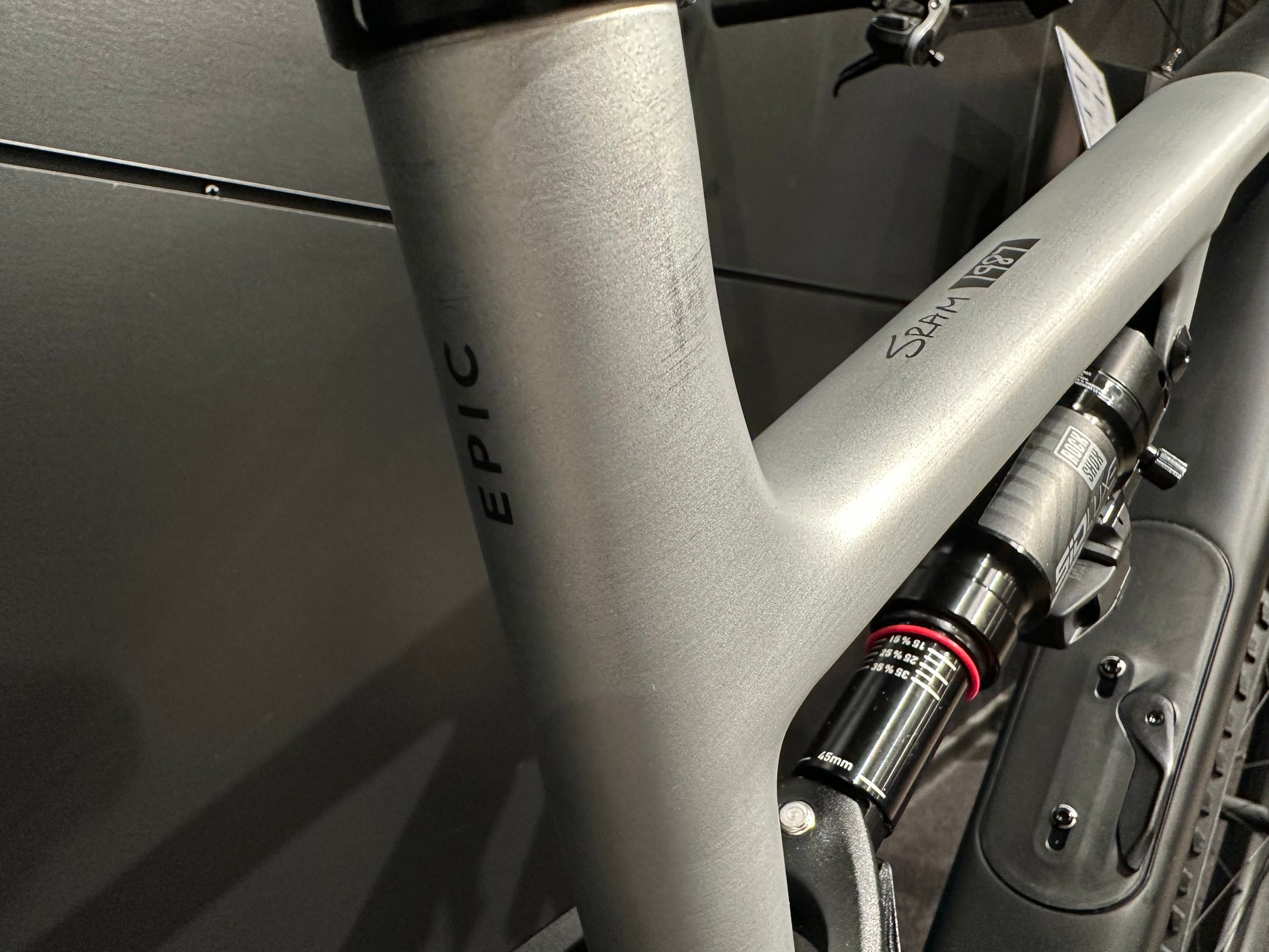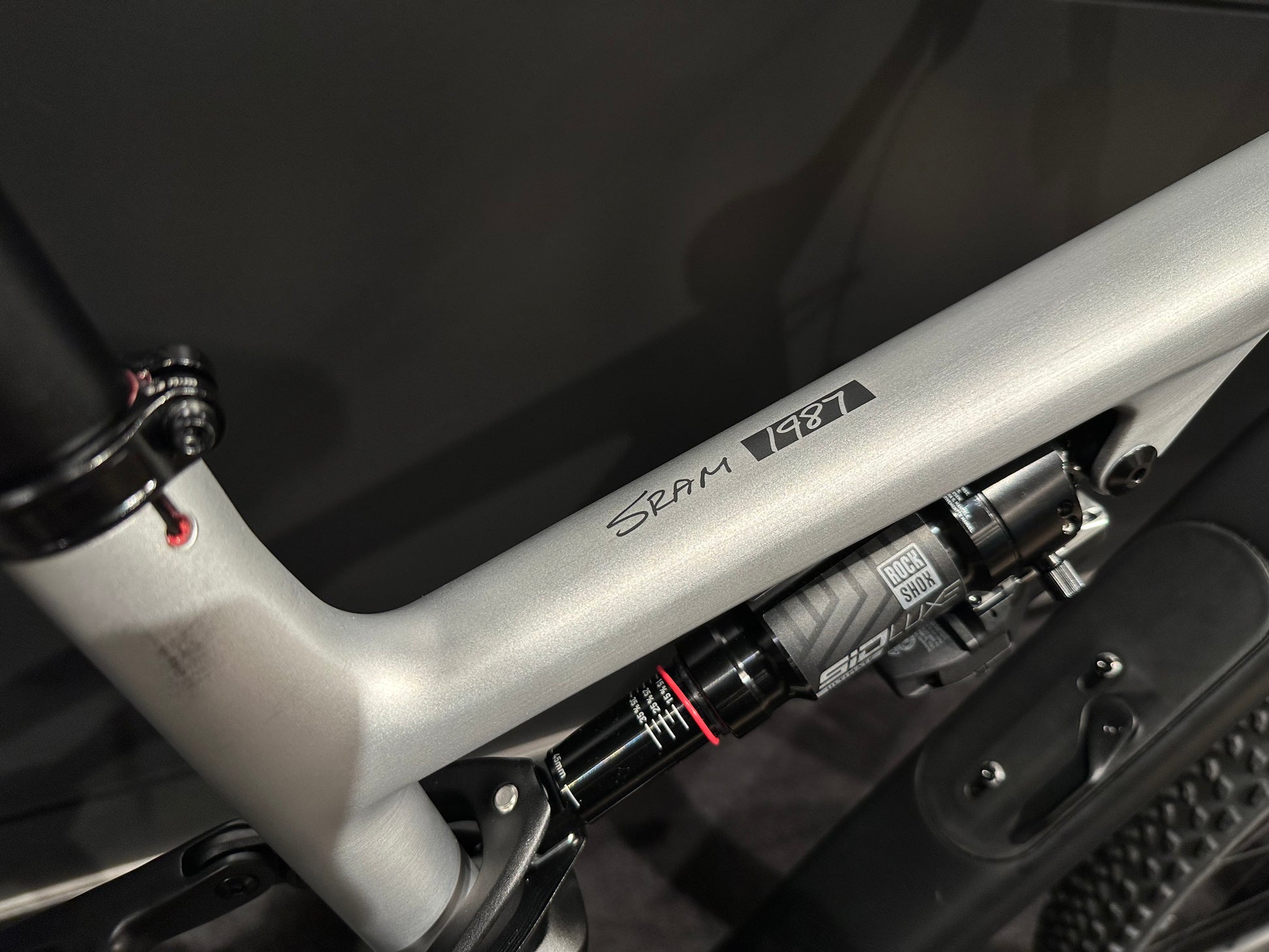 Unieke custom Specialized Epic 8 met lakwerk door Color Monkey en afgemonteerd met SRAM 1987 Limited Edition AXS groepset en RockShox Flight Attendant. Het carbon frame heeft een klassiek mat zwart en geborsteld aluminium ontwerp met het het Specialized en SRAM 1987 wordmark klein op de bovenbuis en het oude RockShox logo op de vorkvork. Uiteraard is de fiets afgemonteerd met de allernieuwste technieken.